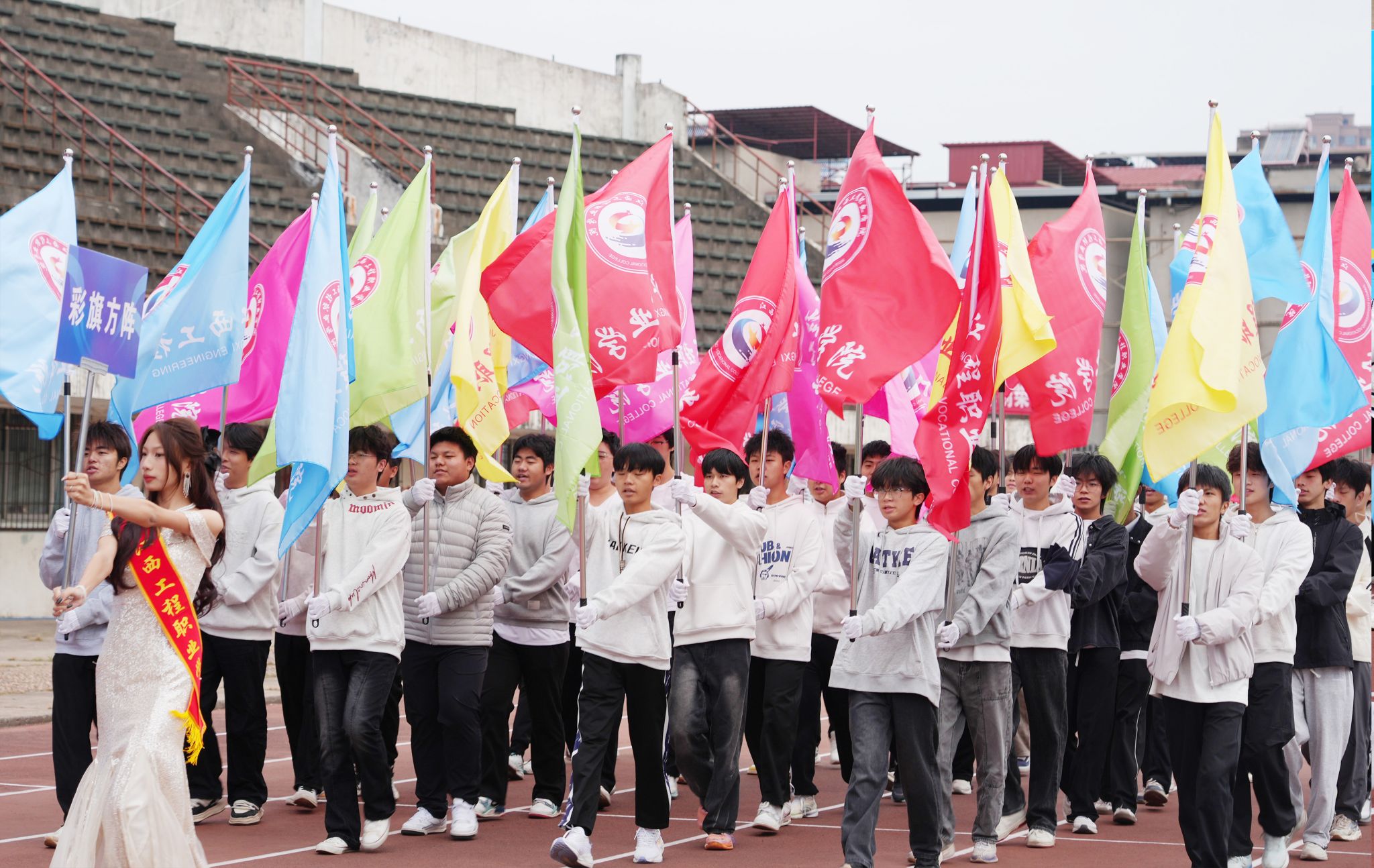 伴随着高昂振奋的运动员进行曲,国旗方阵、校旗方阵、彩旗方阵、鲜花方阵、各学院方阵和裁判方阵依次入场,师生们精神抖擞,步伐整齐,每一步都踏出强国的力量与决心,充分展示了学校师生阳光、健康、活力的精神面貌。